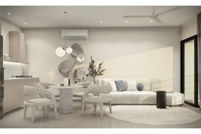 Condominiums just 7 minutes from the beach, very good opportunity for INVESTMENT, 10 minutes from downtown area (boardwalk). ZUL offers you the perfect balance between space, functionality, and a modern design. With views to the mountain and the bay, you will love it. Only 13 units, from 55 m2 to 144 m2, with living room, dining room, kitchen, 1 bedroom – 2 bedrooms and 1 bathroom – 2 bathrooms, balcony or garden, and A/C. ZUL offers you amenities: controlled access, elevator, terrace with pool, barbecue area, bar area and lounge area. Located in Agua Azul neighborhood, closed to the mountain, and near to the beach, to the Romantic Zone and the Boardwalk.
